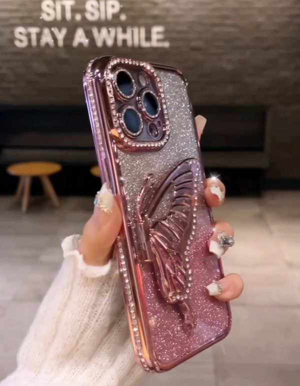 قاب موبایل آیفون پروانه نیم بال صورتی نگینی